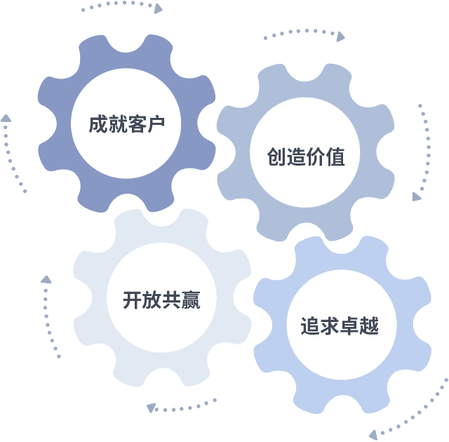 成就客户是一切决策的出发点,,创造价值是衡量所有工作的标准,,追求卓越是我们做事做人的态度,,,,开放共赢是我们的格局也是最终的结果。。。。价值观的齿轮环环相扣,,,,推动着组织里的每个人不断向前。。。。